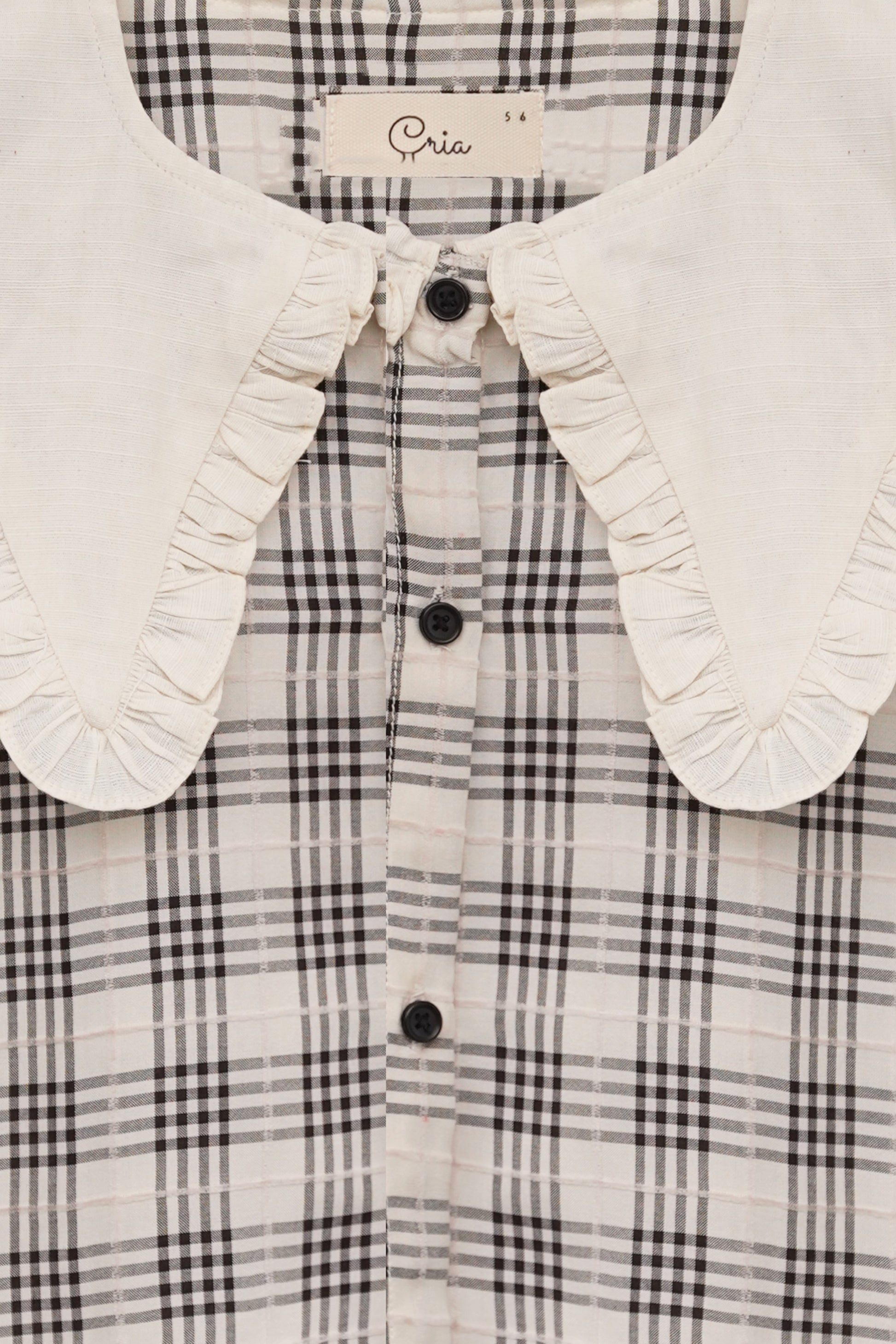 Button-down blouse with scalloped flutter collar and quarter sleeves